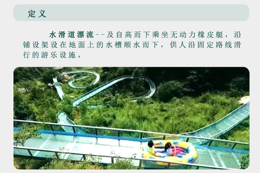 一是,依據(jù)大型生態(tài)漂流的體驗(yàn)感,設(shè)計(jì)優(yōu)化升級(jí)而來(lái)。依地勢(shì)修建漂流槽,槽內(nèi)水深約20公分,水在漂流槽中托船順流而下,速度可控,刺激與安全兼得,確保百分之三百的安全。在設(shè)計(jì)上我們可以做到游客在漂流過(guò)程中基本不濕衣物。我們暫且稱(chēng)這種形式的漂流為水滑道漂流。